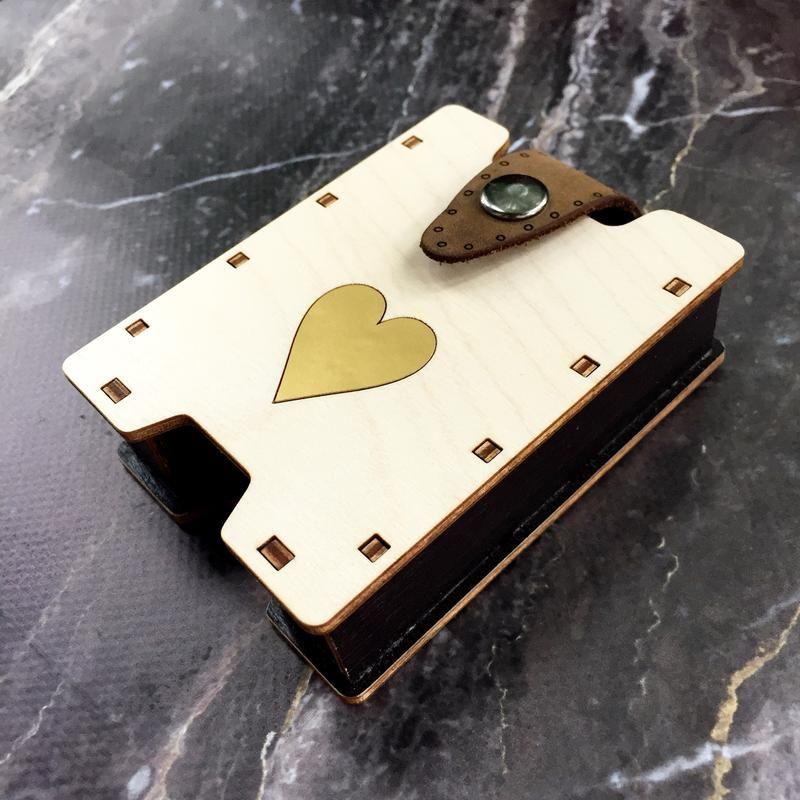 Ви любите грати в настільні ігри? У Вас є улюблена колода карт? Стара упаковка растрепалась? Вам подарували нові карти і зберегти їх в ідеальному стані? Ви хочете зробити подарунок другові? Наші стильні, оригінальні дерев'яні кейси-бокси підійдуть для таких цілей! Застібка з натуральної шкіри, масті інкрустовані шпоном. На бічній стінці інкрустація слів металізованим картоном! Розміри внутрішні: 63 х 26 х 90 мм Зробіть вибір кольори: біла або чорна! Додаткові характеристики: Матеріал: Дерево Матеріал: Фанера Персоналізація: З гравіюванням