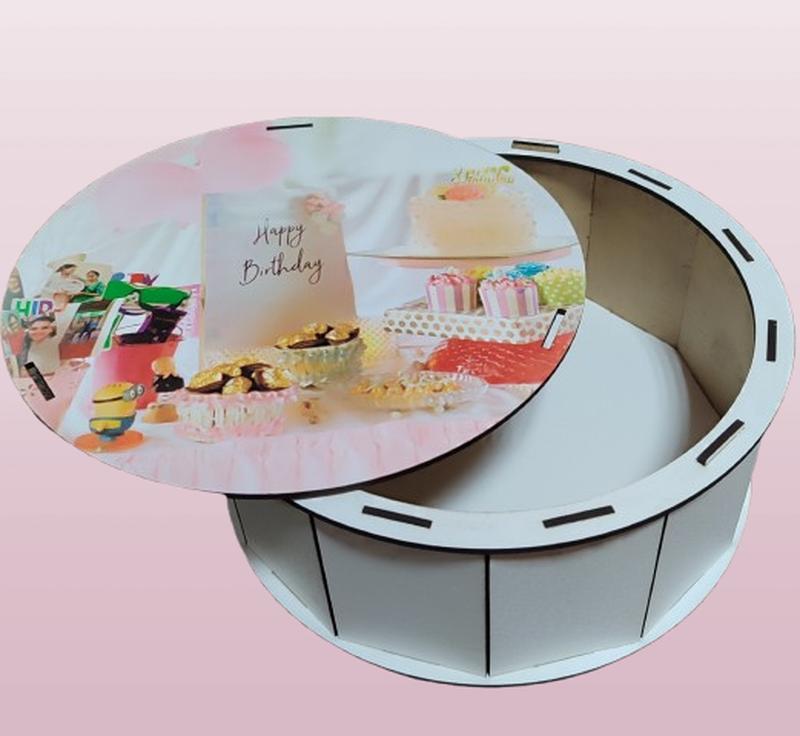 Коробка-сюрприз до Дня народження - створює гарне перше враження та додає подарунку святкового настрою. Кругла форма, діаметр 210 мм, висота 83 мм. Завдяки привабливому дизайну та зручній формі чудово підходить для оформлення подарунків, солодощів, сувенірів, косметики, аксесуарів та інших приємних дрібниць.
