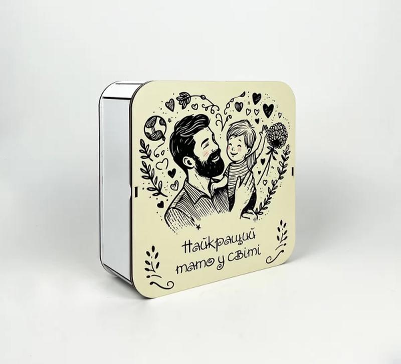 Подарункова коробка квадратна "Найкращий в світі тато" Дерев'яна коробка призначена для оформлення оригінального подарунка, композиції з фруктів, овочів, горішків,солодощів. Виготовлено з високоякісного екологічного матеріалу, ДВП товщиною 3 мм,тому довго буде зберігати свій бездоганний вигляд. З її допомогою можна створити неймовірний гарний презент