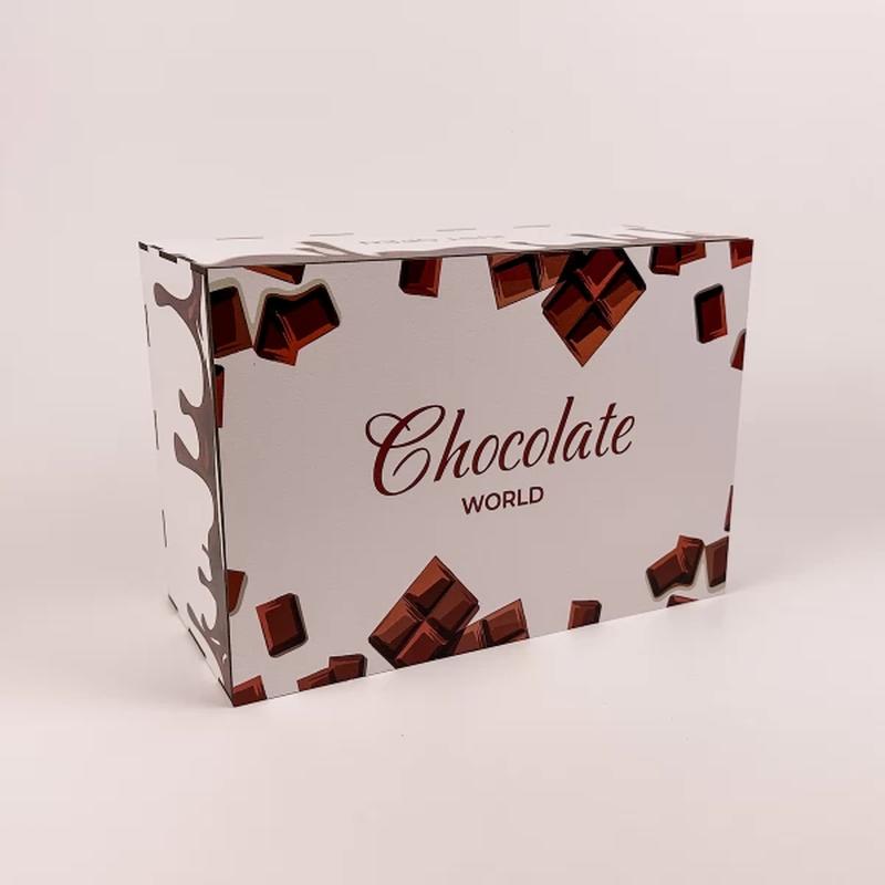Подарункова коробка "Chocolate world" 4 Дерев'яна коробка призначена для оформлення оригінального подарунка, композиції з фруктів, овочів, мила,солодощів. Виготовлено з високоякісного екологічного матеріалу, ДВП товщиною 3 мм,тому довго буде зберігати свій бездоганний вигляд. З її допомогою можна створити неймовірний гарний презент Розмір 4 28х19 см глибина 13 см