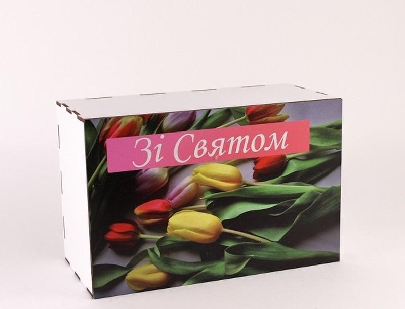 Подарункова коробка "Зі святом" тюльпани 2 Дерев'яна коробка призначена для оформлення оригінального подарунка, композиції з фруктів, овочів, мила,солодощів. Виготовлено з високоякісного екологічного матеріалу, ДВП товщиною 3 мм,тому довго буде зберігати свій бездоганний вигляд. З її допомогою можна створити неймовірний гарний презент, день народження, 8 березня, іменини або інше свято.
