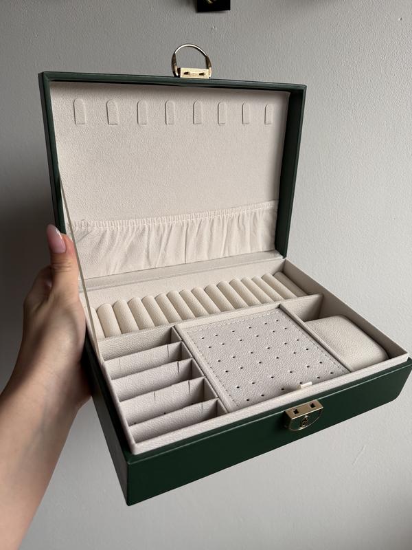 Стильна та містка шкатулка для прикрас у глибокому смарагдово-зеленому кольорі — ідеальне рішення для зберігання коштовностей удома або для подорожей. Продумане внутрішнє наповнення дозволяє акуратно розмістити каблучки, сережки, підвіски, браслети та ланцюжки, не плутаючи їх між собою. М’яка внутрішня оббивка захищає прикраси від подряпин, а металевий замок із ключиком додає відчуття безпеки та приватності. Це не просто органайзер, а елегантний аксесуар для інтер’єру або стильний подарунок для близької людини. ⸻ 💍 Для чого підійде • для зберігання ювелірних прикрас та біжутерії • для організації колекції каблучок і сережок • як дорожня шкатулка • як подарунок на день народження, 8 березня, річницю, Новий рік ⸻ 🛠 Як використовувати 1. Відкрийте шкатулку за допомогою замка 2. Розмістіть прикраси у відповідних секціях 3. Каблучки — у валики, сережки — у спеціальну перфоровану зону 4. Закрийте та зафіксуйте замок ключиком ⸻ 📏 Розмір 23 × 17 × 7 см ⸻ 📦 Комплектація • шкатулка • ключик ⸻ 🌍 Країна виробника Китай ⸻ 🧵 Матеріали • зовнішнє покриття: екошкіра • внутрішня оббивка: м’який текстиль / велюр • фурнітура: метал ⸻ ⭐ Переваги • ✔ містка та функціональна • ✔ окремі відділення для різних типів прикрас • ✔ м’яке внутрішнє покриття — захист від подряпин • ✔ замок з ключиком • ✔ стильний преміум-вигляд • ✔ чудова ідея для подарунка