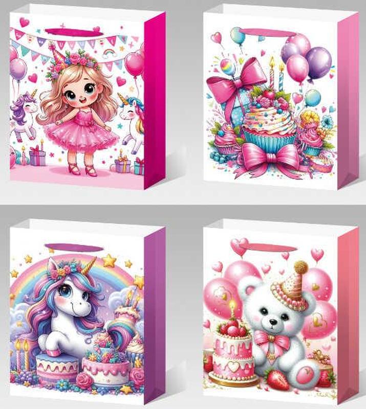Компактний подарунковий пакет із малюнками Подарунковий пакет розміром 18х10х23 см із зручними шнурковими ручками. В наборі представлені 4 різні дизайни з милими та яскравими зображеннями, що створюють святковий настрій. Ідеально підходить для пакування подарунків на дитячі дні народження та інші урочистості. - Розмір: 18х10х23 см - Тип ручки: шнурок - Різні яскраві дизайни - Підходить для святкових подарунків