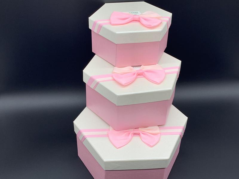 Коробка подарункова шестикутник з бантиком. три шт/комплект. колір біло-рожевий. 19х10см....