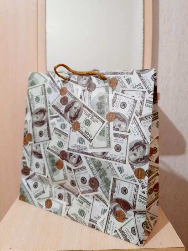 Пакет з картону (малюнок-долари), ручки роздільні зі шнурка. Розмір висота-24,5см, ширина-24,5, глибина-8см.