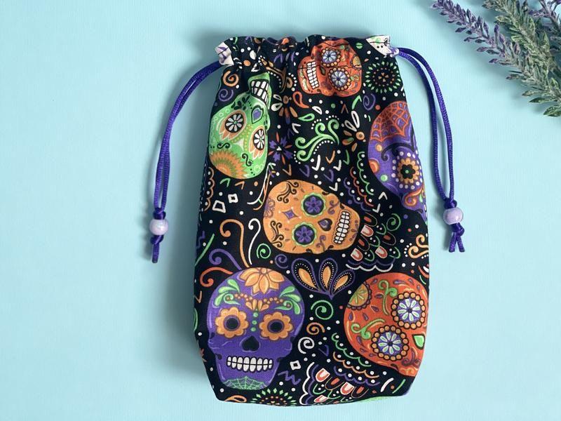 Мешочек с принтом цветных черепов изготовлен из качественного американского хлопка, подкладка из сатина, затягивается атласным шнуром с бусинами. Мешочек станет удобным и оригинальным местом для хранения ваших карт, рун или кристаллов, а также любых ценностей или украшений. Мешочек рассчитан для стандартных колод карт Таро. Размер мешочка: 9 см x 4 см (ширина дна) х 17 см или 13см х 17см полный размер