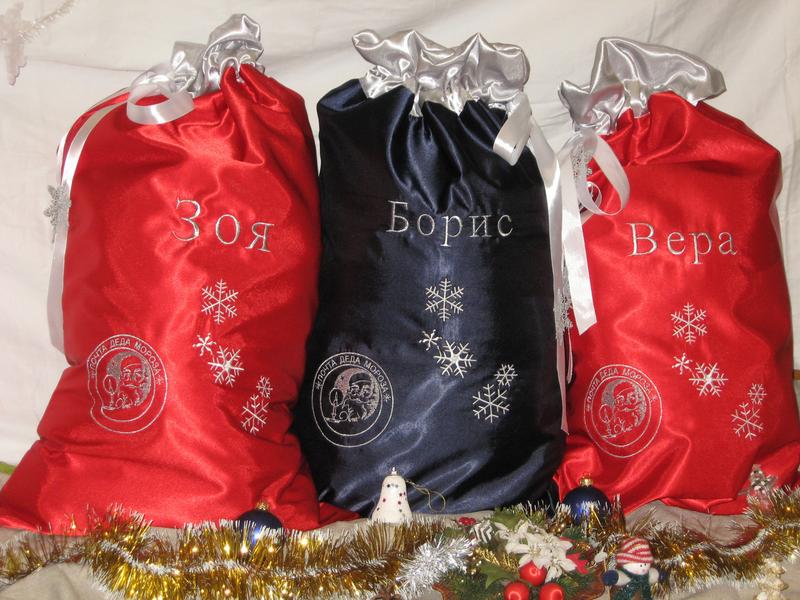 Мешок под елку большой 70 х 50 см из атласа именной ′От Дедушки Мороза′ с вышивкой. Мешочек с вышивкой имени Вашего ребенка, печать ′Почта Деда Мороза′, снежинки и снежинка кружевная(на завязках), можно использовать как елочную игрушку. Изготовлю по вашим размерам, цена договорная. Товар НЕ производится в Китае.Штучное производство,ручная работа