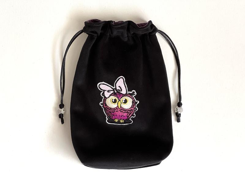 Оксамитовий мішечок з аплікацією-вишивкою милої сови. Виготовлений зі щільного оксамиту чорного кольору, підкладка із сатину темно-бузкового кольору, затягується атласним шнуром з намистинами. Мішечок розрахований для стандартних колод карт Таро, а також чудово підійде для зберігання прикрас чи подарунку. Розмір мішечка: 9 см x 4 см (ширина дна) х 17 см або 13см х 17см повний розмір