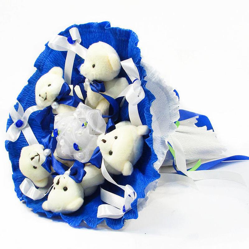 Букет из игрушек Мишки 5 синий 5290IT Очень красивый букет! Букет из игрушек Мишки 5 шт сделан из медвежат белого цвета. Мишутки очень забавные и милые, шейка каждого из них украшена бантиком.В букетике расположен красиво оформленный белый цветок с вкраплениями маленьких розочек. Между игрушками прикреплены бантики с розочками. Внешне композиция выполнена в цветовой гамме, украшена бусинками и бантиками. Ручка букета перевязана красивыми атласными ленточками. Яркий и необычный плюшевый букет станет нетривиальным презентом. Подарите с его помощью море радости и незабываемые эмоции. Композиция состоит из 5 мишек. Размеры букета 27х30 см .При отправке букет упаковывается в коробку с объемным весом 5 кг. Поскольку композиция является авторской, повторить ее дважды до мельчайших деталей невозможно, некоторые элементы декора могут быть изменены, при этом сохраняется общий стиль композиции. ВАЖНО! Данные букеты Изготавливаются под заказ, только по предоплате. Срок изготовления 1-3 дня. Возврату и обмену не подлежат.