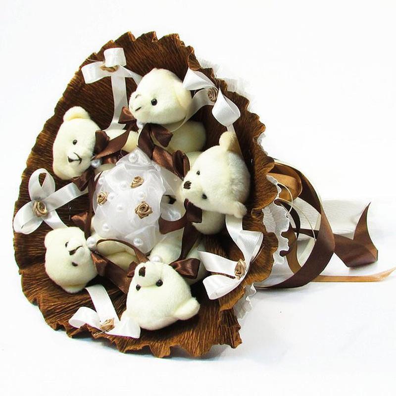 Букет из игрушек Мишки 5 коричневый 5287IT Очень красивый букет! Букет из игрушек Мишки 5 шт сделан из медвежат белого цвета. Мишутки очень забавные и милые, шейка каждого из них украшена бантиком.В букетике расположен красиво оформленный белый цветок с вкраплениями маленьких розочек. Между игрушками прикреплены бантики с розочками. Внешне композиция выполнена в цветовой гамме, украшена бусинками и бантиками. Ручка букета перевязана красивыми атласными ленточками. Яркий и необычный плюшевый букет станет нетривиальным презентом. Подарите с его помощью море радости и незабываемые эмоции. Композиция состоит из 5 мишек. Размеры букета 27х30 см .При отправке букет упаковывается в коробку с объемным весом 5 кг. Поскольку композиция является авторской, повторить ее дважды до мельчайших деталей невозможно, некоторые элементы декора могут быть изменены, при этом сохраняется общий стиль композиции. ВАЖНО! Данные букеты Изготавливаются под заказ, только по предоплате. Срок изготовления 1-3 дня. Возврату и обмену не подлежат.