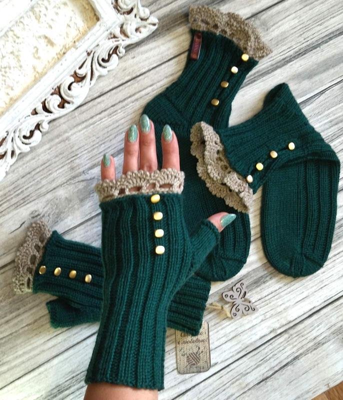 Найкращий подарунок ручної роботи - Красиві жіночі Шкарпетки + В'язані Мітенки з ніжної, шовковистої вовни мериноса. Смарагдовий колір пряжі чудово відтіняє декор із намистин мідного відтінку, додаючи виробам шляхетності та вишуканості. Жіночі шкарпетки та в'язані мітенки оброблені мереживом, пов'язаним гачком із вовняної пряжі "лляного" кольору. Гарний подарунковий набір - в'язані шкарпетки+мітенки стане оригінальним та корисним подарунком. Всі мої в'язані вироби ручної роботи відрізняються не тільки унікальністю, вони несуть у собі позитивну енергетику. Матеріал: вовняна пряжа меринос, намистини та бирка. Розмір: 37-39 Купити в'язані шкарпетки з тих, що є в наявності https://bonami.************* або можна замовити красиві жіночі шкарпетки або в'язані мітенки необхідного розміру та кольору. У мене ви можете купити чоловічі в'язані шкарпетки, теплі шкарпетки для дому, вовняні шкарпетки для дітей, жіночі в'язані мітенки, теплі чоловічі рукавички без пальців та інші в'язані вироби ручної роботи.