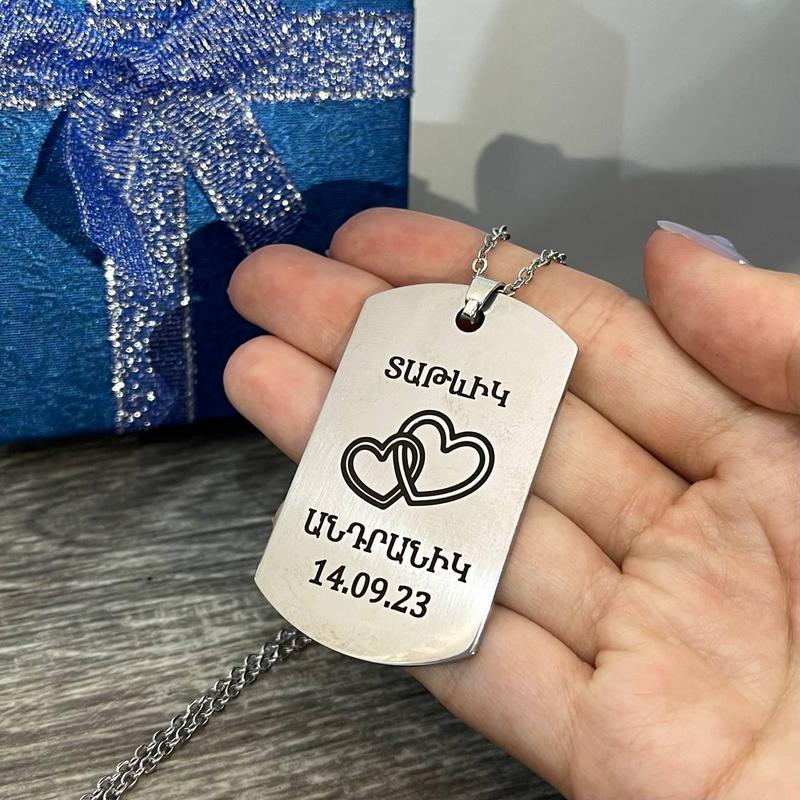 Класичний сталевий жетон з іменним написом або малюнком - оригінальний персональний подарунок чоловікові, другові, братові чи синові, дівчатам та хлопцям, колегам. Особливо підходить для військовослужбовця ЗСУ. Додатково комплектуємо гарною подарунковою упаковкою Вже досить довгий час армійські жетони залишаються одними із найпопулярніших аксесуарів для чоловіків, а іноді й жінок. Вони носяться переважно на шиї та містять інформацію про військовий підрозділ, символізують мужність, патріотизм чи життєве кредо. Нанесення на армійські жетони зображень або написів за допомогою лазерного гравіювання перетворює їх на стильні та мужні прикраси одночасно. Підходить у тому числі для екстремальних умов експлуатації. Робимо нанесення будь-якого тексту (будь-якою мовою, будь-яким шрифтом), а також зображення, герби, логотипи і т.д. До кожного клієнта індивідуальний підхід! Ось наші реальні фото та відео, зняті з реальних моделей і зразків: ### Ціна вказана з урахуванням вартості виготовлення одного простого напису, малюнка з однієї сторони на чистій сталевій пластині без урахування подарункового паковання. Можна додатково зробити більш складний напис з двох сторін. Вартість додаткових послуг погоджується в залежності від складності та терміновості замовлення. Порядок оплати та виготовлення: жми на посилання тут (посилання активне)! ### ### Матеріал: суцільна, без напилення неіржавіюча ювелірна медична сталь марки 316 L, яка не облазить і не змінює колір під дією води, навіть морської! Розміри жетона (вимірювання зроблені вручну та не претендують на високу точність) 50 х 29 міліметрів. Вага приблизно 30 грамів - відчувається приємна важкість справжньої сталі! ### Переваги - є оригінальним унікальним подарунком із персональним пам'ятним написом - надійний, міцний і довговічний - не змінює згодом колір і форму, напис не стирається - чудовий сувенір на будь-який вік і для будь-якої ситуації Ви можете вибрати інший варіант комплектації прикрас за допомогою додаткових фото на сайті. Будь ласка, уточніть ціну та наявність вибраних варіантів перед оформленням замовлення. Крім того, додатково ми можемо підібрати для Вас подарункове паковання (посилання активне) з урахуванням ваших побажань! Найпопулярніший варіант упаковки Ви можете побачити на наступному нашому авторському фото: Наші авторські фото та відео охороняються законом. Усі вироби проходять сертифікацію та є повністю безпечними у використанні. Експрес - доставка Новою поштою та Укрпоштою по всій Україні. Замовлення легко зробити за кілька хвилин, виберіть зручний для Вас варіант - оформіть замовлення на сайті, заповнивши просту форму заявки - або напишіть нам на *****, ******** або в чат на сайті - або зателефонуйте нам по одному з телефонів, зазначених на сайті - у коментарях до замовлення вказуйте, що хочете нанести на виріб - після обробки замовлення з Вами зв'яжеться наш менеджер та уточнить усі подробиці замовлення Також заявки на замовлення Ви можете надсилати на нашу ел. пошту ********@********** - кількість комплектів, інформацію для нанесення гравіювання, побажання щодо зображень, шрифту, розташування і т.д. - дані одержувача: ім'я, прізвище, місто, склад НП, контактний номер телефону - дані замовника: ім'я, телефон для зв'язку (бажано з ***** або ********) Чому нам довіряють 1. Ретельно перевіряємо товар та 