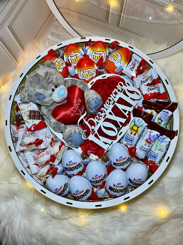 Ніжний подарунок з ароматними мильними трояндами, що не в`януть роками, найсмачнішими цукерками та топером-вітанням Подарунок, що викличе море позитивних емоцій та 100% сподобається 😍 Ми допоможемо зробити найкращий подарунок Вашим рідним ❤️ До складу входить: - Мильні троянди червоного кольору - 9 шт. - Дерев'яна коробочка ручної роботи - 1 шт. - М'яка іграшка ведмедик Тедді - 1 шт. - Шоколадне яйце Кіндер сприз - 7 шт. - Шоколадне яйце Кіндер Джой - 5 шт. - Шоколад зі злаками Кіндер кантрі - 3 шт. - Кокосові цукерки Ферерро Рафаелло - 8 шт. - Шоколадні цукерки Кіндер хепі моментс міні - 5 шт. - Шоколадні цукерки Кіндер буено міні - 8 шт. - Шоколадні Цукерки Кіндер чокобонс - 10 шт. - Напис дерев'яний в асортименті - 1 шт. - Наповнювач стружка з натурального дерева Розміри (33см×29см×10см) Склад можна змінити, дивлячись на ваш смак 🙂 ▪️Виготовляємо набір за 1 день, якщо замовлення оформлене до 15:00, відправляємо в той же день⏱ ▪️Оплата при отриманні або на карту 💳 ▪️Надсилаємо Новою Поштою Є запитання або хочете зробити замовлення? Телефонуйте ) Чому Вам варто замовити у нас? - 100% гарантія отримання замовлення - Обмін або повернення грошей, якщо товар Вам не підійшов - Більше 2-х років на ринку з позитивними відгуками - Свій власний склад - Весь асортимент в наявності. Чекати не треба! - Швидка доставка по Україні 1-2 дні. З повагою, Інтернет-магазин GoShop!