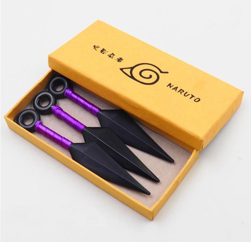 Набор игрушечных японских кинжалов Kunai из знаменитого анимационного сериала - Наруто! Не может использоваться как оружие. Кинжалы выполнены из пластика. Рукоятка обмотана фиолетовой тканью. Кунаи упакованы в подарочную коробочку с принтом знака Наруто. Отличный подарок любому фанату аниме! Комплект: 3шт. Длинна: 13см. Артикул: VA-977824527