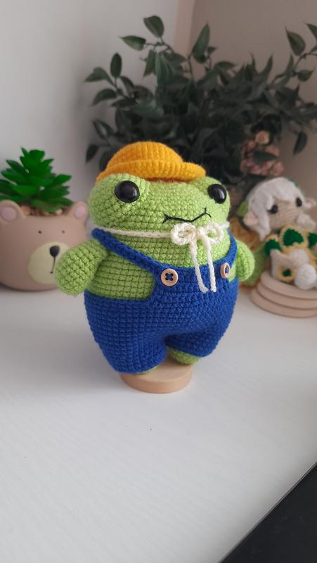 Забавный лягушонок в синем комбинезоне и жёлтой панамочке. Связан с любовью к деталям🧶💕 Возможно изготовление жабки и одежды в других цветах. Так же, возможно внесение любых изменений. Беру индивидуальные заказы на другие игрушки ✔️ Одежда снимается. У лягушонка есть попа. Все материалы безопасны для детей и аллергиков. Глаза на безопасном креплении, пуговички надёжно пришиты. Рост лягушонка примерно 12,5 см. Подставочка продаётся отдельно - 80 грн