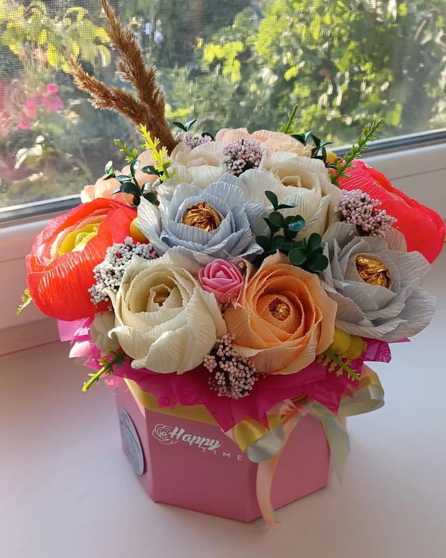 Ніжна, елегантна композиція в шляпній коробочці 💕 13 ніжних квітів і в кожній цукерка Truffle 🥰 🎁 Стильна композиція, яка простоє не один рік 🌿 + прозоре пакування ✨️ Ті самі квіти, які стоятимуть декілька років🍀 Ціна 700гр (в наявності) Все буде Україна 🇺🇦 Топер + 25 грн, листівка +10 грн