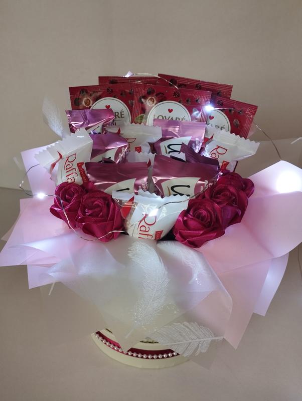 Сладкий бокс в состав которого входит вкусный чай, конфеты Rafaello, конфеты Королевский Шарм и розы которые изготовлены из атласной ленты 🍬🥀