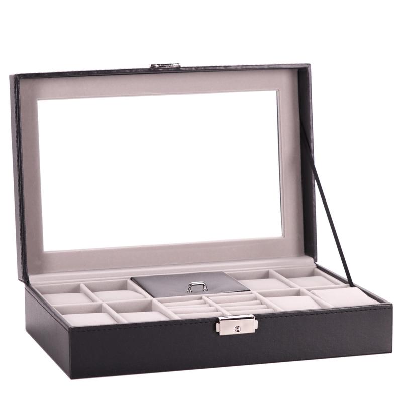 Шкатулка для зберігання 8-ми годинників. Додаткове місце для зберігання кілець/ювелірних прикрас. Матеріал корпусу - PU шкіра, скло. Колір - чорний. Інтер'єр - світлий оксамит. Розміри шкатулки: довжина 30 см ширина 20 см висота 8 см Виробник - Craft, Taiwan.
