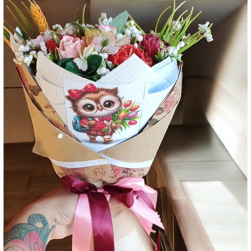 — **Букет "Первый Звоник"* Встречайте новый учебный год с нашим уникальным букетом из милой ручной работы, оформленной в стильном крафт-бумаге! Этот букет - идеальный подарок для учителя, учащихся и всех, кто любит праздник знаний. Каждый элемент букета изготовлен из натуральных ингредиентов, обеспечивающих нежный аромат и приятную текстуру. Яркие цвета мыла создают атмосферу радости и вдохновения, а крафт-бумага придает композиции естественный шарм и элегантность. Букет "Первый Звоник" станет не только прекрасным украшением, но и практичным подарком: мыло можно использовать для ухода за кожей. Подарите своим близким частичку тепла и любви в начале учебного года!