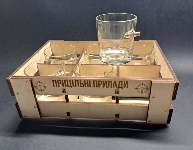 Незабутній подарунок для справжніх чоловіків.Набір склянок для віскі із застряглою кулею, в дерев'яному ящику. У набір входить 4 або 6 склянок для віскі, об'ємом 250 мл. Оригінальні скляні склянки ручної роботи, з вплавленою справжньою кулею калібром 7.62. Куля абсолютно безпечна. Дерев'яна коробка на 4 або 6 комірок, з дерев'яною стружкою. Ціна набору на 4 склянки - 1850 грн., на 6 склянок - 2450 грн. Можливе нанесення малюнків або логотипів за вашими ескізами, методом лазерного гравіювання на склянки або ящики.