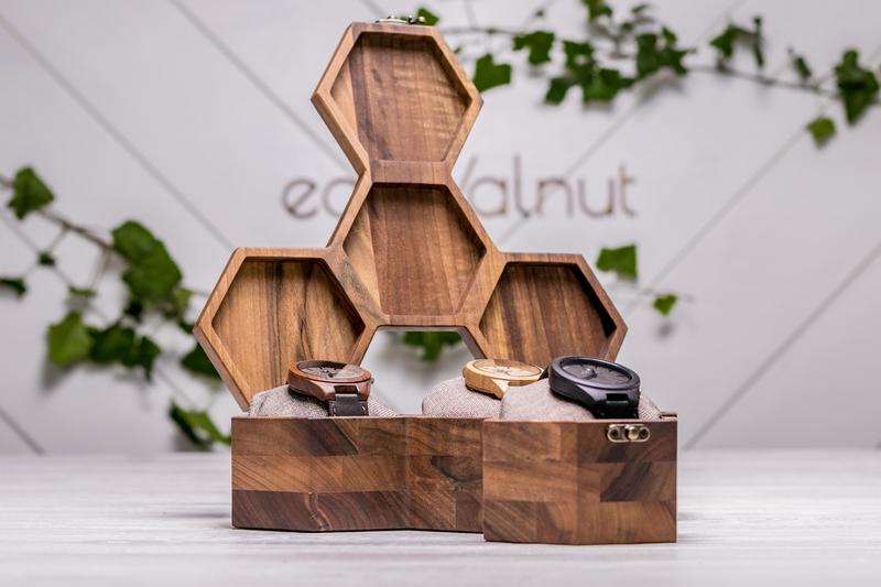 EB-16.4.1 Сотовая шкатулка для 4 часов со стеклянной крышкой Представляем Вашему вниманию новые премиальные шкатулки для хранения на подушечках наручных часов. Комбинация из пчелиных сот в зависимости от количества ячеек делает изделие новым, уникальным и необычным органайзером среди нашего ассортимента. Данные коробочки разработаны в различной конфигурации (от 1 пары часов до 10). Древесина грецкого ореха придает изделию премиальный внешний вид, качественная металлическая фурнитура грамотно подобрана под размер самого изделия и добавляет элегантности данным шкатулкам. Благодаря использованию эксклюзивной древесины, металлических (а не пластиковых) креплений, стекла (а не акрила), дорогой ткани и натуральных масел это изделие будет очень ценным и стоящим подарком для любого человека, кому важен комфорт и порядок в личном пространстве. В зависимости от количества ячеек коробочки комплектуются подушечками для часов из приятной на ощупь ткани и качественных материалов, что делает изделие долговечным и удобным в использовании. В отличии от других шкатулок нашего производства, в сотовых шкатулках крышка фиксируется вертикально, что также является уникальной особенностью этих изделий. Внутренний размер ячейки: 80 мм между параллельными ребрами шестигранника, 68 мм - высота ячейки. Этого более чем достаточно даже для самых массивных часов, поэтому они точно не будут упираться в стекло шкатулки. В нашем ассортименте также представлены идентичные коробочки с деревянной крышкой. Размер в зависимости от количества ячеек: 4 - 271х235х78 мм; Изделие продается в аккуратной картонной коробке, пригодной для вторичной переработки. По желанию клиента мы можем выгравировать Ваши инициалы, любимую цитату или логотип компании в любом месте на нашем продукте (и на дереве, и на стекле) или даже изменить его конструкцию по Вашему запросу. Кроме этого, мы обернем Ваш заказ в подарочную упаковку или вложим поздравительную открытку с Вашим сообщением, если Вы нас об этом попросите. Обратите внимание: цвет Вашего продукта может незначительно отличаться от изображения, поскольку каждое изделие имеет индивидуальные и уникальные характеристики и особенности древесины. Ежедневно отправляем заказы Укрпочтой (бесплатно от 1000 грн) или Новой Почтой (бесплатно от 2000 грн). Материал: высококачественная обработанная древесина грецкого ореха, пропитанная натуральным маслом. Сделано в Украине по всем стандартам eco-продукции.