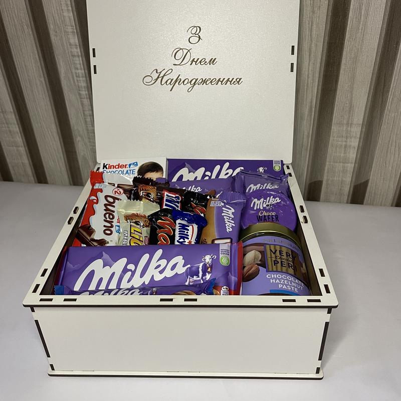 Женский подарочный бокс в деревянной коробке с сладостями milka и другими на день рождения