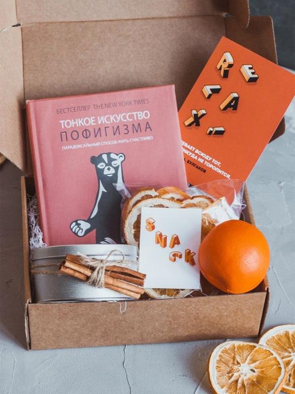 Подарочный набор с книгой Тонкое искусство пофигизма Оригинальный подарочный набор для любителей читать. В наборе есть книга бестселлер Марка Мэнсона "Тонкое искусство пофигизма". А для приятного прочтения книги набор дополнен чаем и апельсиновыми чипсами. В набор входит: - чай зеленый 50г - апельсиновые чипсы 30г - антистрессовый мячик - открытка - палочки корицы 2 шт - книга "Тонкое искусство пофигизма" - подарочная упаковка Срок изготовления 1-2 дня