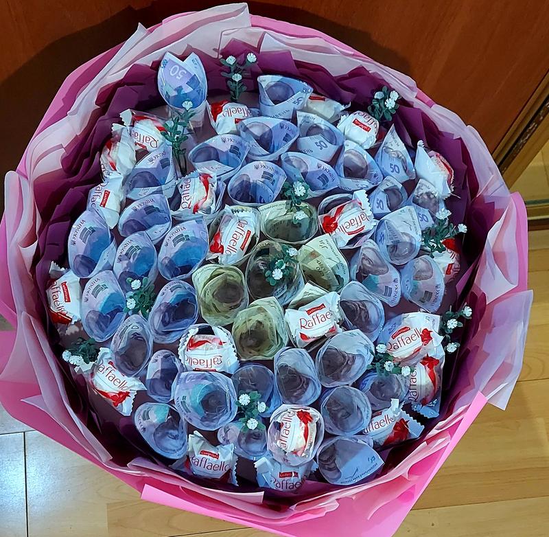 Дарить деньги уже не актуально.Новый тренд это денежный букет с конфетами и цветами.Такий букетик подойдет к любимому празднику. Суммар купюр может быть любой. Это зависит от того, на что вы рассчитываете.Цена букетика считается индивидуально. На фото букет с 38купюр по 50грн,6куюр по 100грн и 1шт. 500.Всього 3000грн.Одная упаковка рафаэлло(21шт)та гипсодилы. Дарите деньги оригинально вместе с нами. Изготовление заказа от 3 до 7днов в зависимости от сложности.