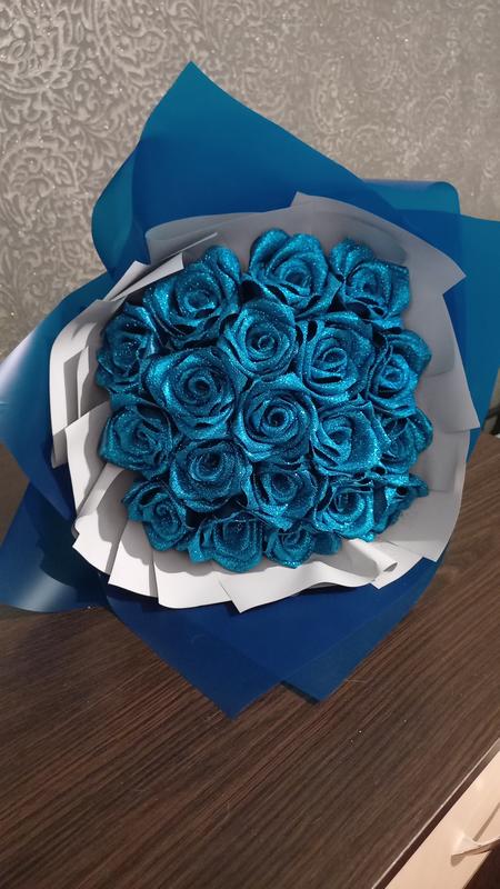 Букети троянд з атласної стрічки В наявності (фото 1-2) -19 шт, ціна за букет 585 грн В наявності фото(3-4)- 35 шт, ціна 950 грн Букет який буде дарувати радість дуже довго Також можливе виготовлення на замовлення Продаж через шафу + 70 грн коміссія