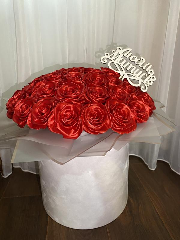 Невероятно красивый букет из атласной ленты, 47 роз в бархатистой коробке, невероятный подарок от которого все будут в восторге. Количество роз можно выбрать любую, возможно выбрать другой Топпер или же с добавлением бабочки, также можно выбрать другой цвет ленты и упаковку Срок исполнения 4 дня Для подробной информации обратитесь в личные