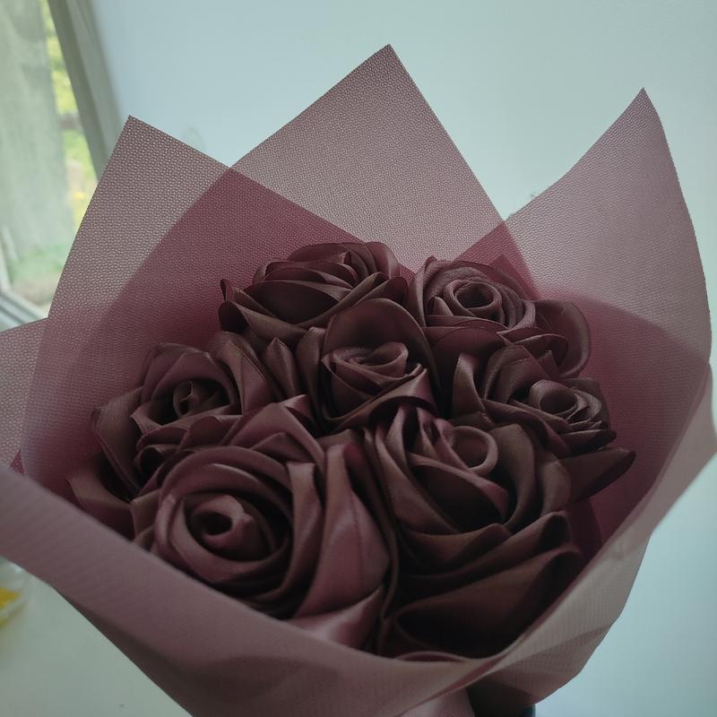 Нежный классический букет из роз, выполненный вручную из атласной ленты. Идеально подходит в качестве подарка, для фотосессий, декора комнаты или свадебного оформления. Цветки не увядают, сохраняют форму и вид годами.