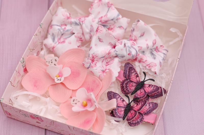 Набор украшений выполнен в персиковом цвете. Отличный подарок на день рождения и любой праздник Набор состоит: 1. бантики из принтованной ленты на резинках размером 10*7 см 2. орхидеи из фоамирана на заколках размером 7*6 см 3. бабочки на заколках размером 5,5*3,5 см Все украшения упакованы в праздничную коробочку размером 15*15*3 см