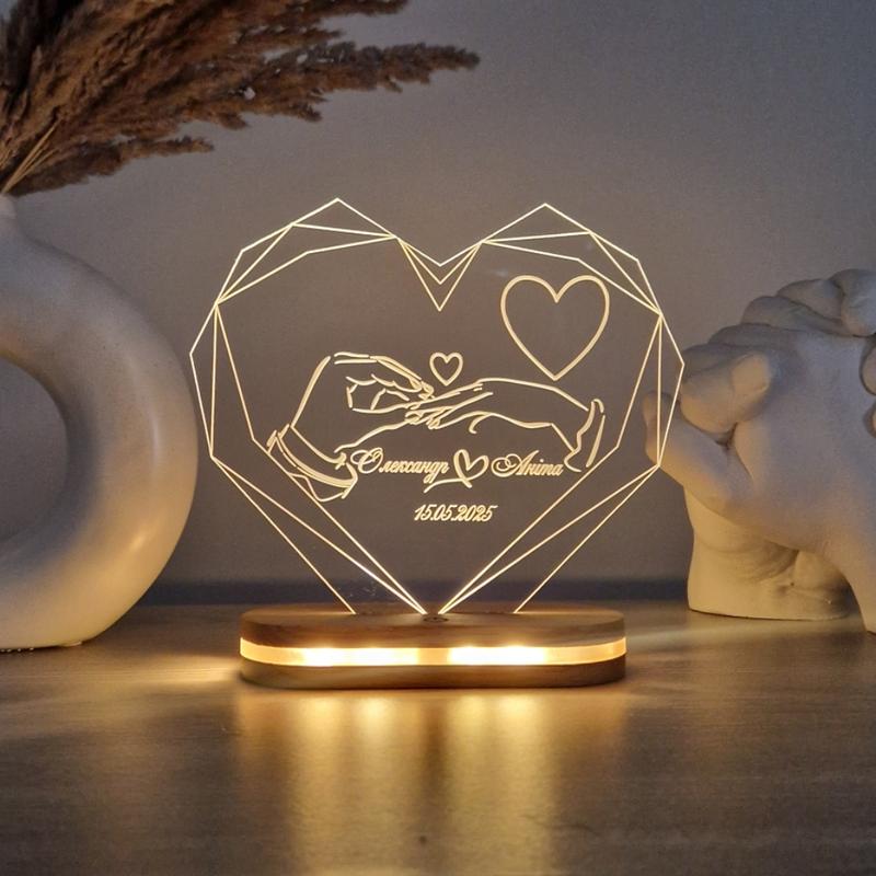 Світильник нічник, з Гравіруванням подарунок на хрестини,весілля, річницю, та день народження.В наявності нічники 3 форм: Розмір 12/16 см прямокутний, 15 см круглий, та 16/16см серце. Гравірування може бути будь яке. Світильник має в комплекті блок живлення, та type C кабель. Можна використивувати від мережі, або повербанку. Підставка дубова. Також є варіанти підставки з вбудованим акумулятором, що робить світильник більш універсальним, та дає можливість встановлювати його будь де. На одному заряді світильник світить 72 год на максимальній потужності, після чого ще 72 год на меншій потужності. Час зарядки 4 години. Ціна стандартна: 699 грн Ціна з АКБ: 1199 грн.
