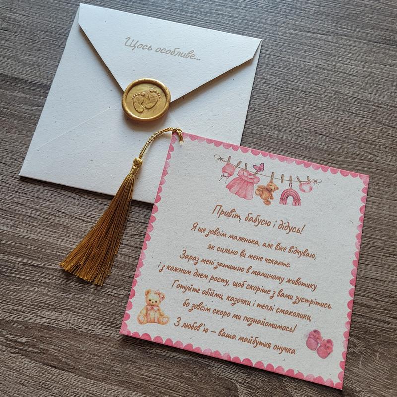 Сповіщення батькам про вагітність 💖 250 грн/шт Розробка індивідуального текста 300 грн. Конверт 12,7*12,7 см. Картка 12,2сс*12,2 см. Картон бежевий з вкрапленням, китиця, сургучний відтиск, конверт закривається на магніти. Термін виготовлення 3 дні.