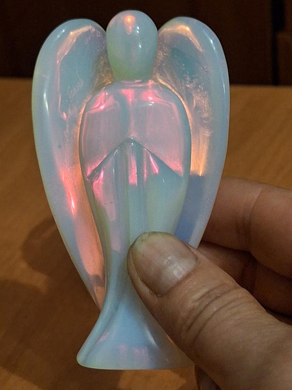 Фігурка ангела, виготовлена зі опалу. Опал — це дорогоцінний камінь, відомий своєю яскравою грою кольорів, яка надає фігурці унікального сяйва. Опалові фігурки, такі як ця, часто є популярними колекційними предметами та подарунками завдяки їхній красі та рідкості. Ця фігурка ангела-охоронця символізує спокій і чистоту, а опал, з якого вона виготовлена, також асоціюється з енергетичними цілющими властивостями. Кожен опал є унікальним, що робить кожну фігурку єдиною у своєму роді. Висота фігурки 9 см.
