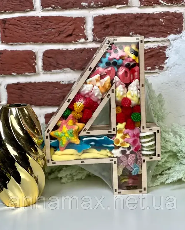 Бюджетна цифра у форматі Віп плюс Оригінальний подарунок, який запам'ятається! – відмінний вибір для тих, хто хоче зробити приємний сюрприз. Що варто знати про цей набір? Фарбоване ДВП – гарний вигляд за меншу ціну – це економний варіант, але менш довговічний, ніж дерев'яна основа. Вимагає обережного використання – матеріал не такий стійкий до пошкоджень. Може трохи змінювати аромат цукерок – дерево має природні антисептичні властивості, а ДВП – ні. Привабливий подарунок за вигідною ціною – стильний, святковий, доступний! Розмір: 32×24×5 см
