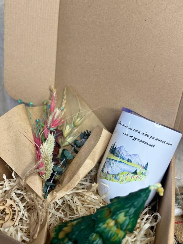 Новогодний подарочный набор. Подарите тепло и хорошее настроение тем, кого любите.🎁 Этот стильный подарочный набор станет отличным презентом для ваших близких в новогодний период. Он создан для того, чтобы принести тепло, аромат и красоту в любой дом. В набор входит несколько элементов, придающих ему особый шарм: Свеча ручной работы в виде елки: высотой 11 см эта свеча имеет нежный аромат, создающий уют и праздничную атмосферу. Изготовлена из натурального пчелиного воска, она горит чисто, без дыма, даря приятный свет и атмосферу покоя. Металлическая термочашка с иллюстрацией гор и мотивационной надписью “Навіть найвищі гори підкорюються тим, хто не зупиняється”. Идеальный спутник для путешествий, работы или прогулок. Мини-букетик сухоцветов — стильное украшение, долго сохраняющее красоту и настроение природы. Деревянная бирка “З Новим Роком” - теплый акцент, что добавляет праздничности. Все упаковано в экологичную коробку с древесной стружкой - готово к дарению! Этот набор идеально подходит для: новогодних и рождественских приветствий корпоративных подарков сюрприза для близких или коллег