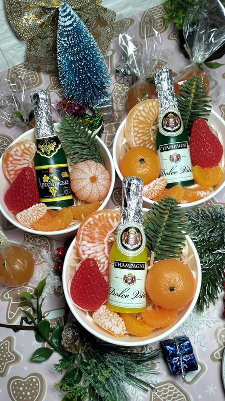 Подарунок на корпоратив | новорічний набір з мила | шампанське+мандаринки+полуниці