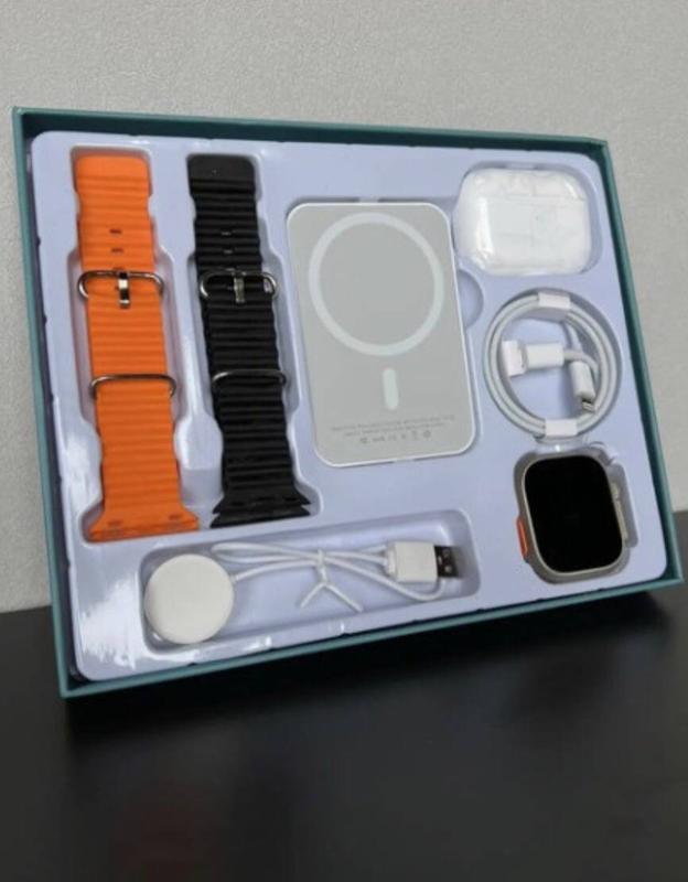 Дуже крутий набір на подарунок, в комплект входять смарт часи, зарядка до них, та два ремінці, павербанк, та безпровідні навушники і зарядка ідеальний набір на подарунок за приємною ціною