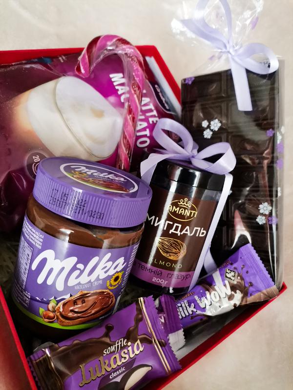 Вміст боксу: 🍭Шоколадна паста Milka 🍭Капучіно 0,5 кг 🍭Шоколадка Trapa 🍭Мигдаль в шоколадній глазурі 🍭Батончик, льодяник і багато інших солодощів 🍭Авторське оформлення