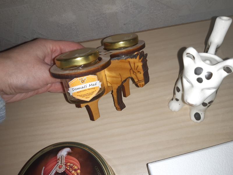 Цікаві маленькі баночки для меду. На дерев'яній підставці у формі віслючка. Привезені з Чорногорії.