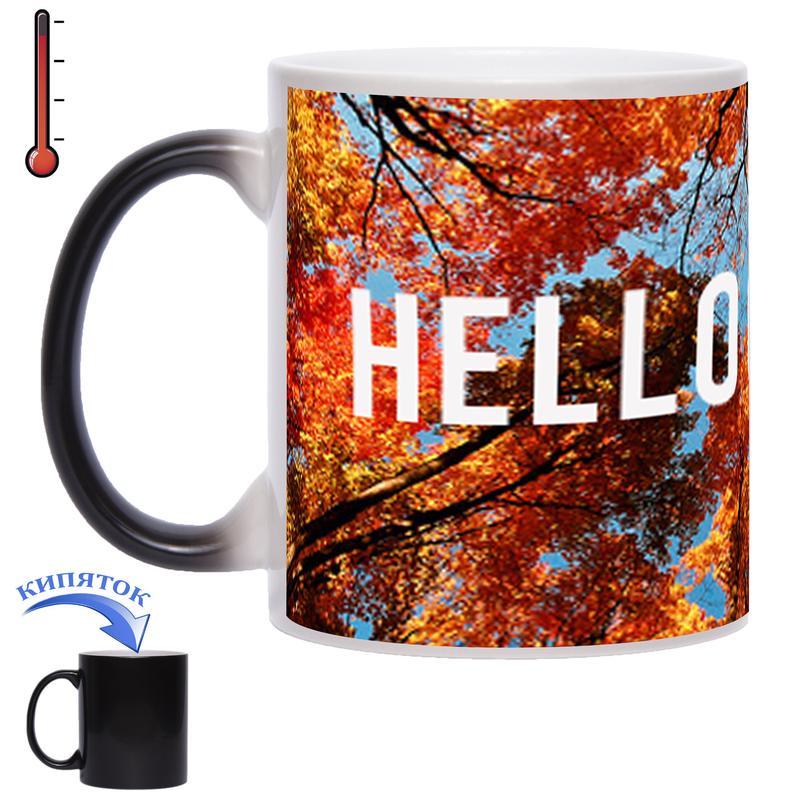 Чашка хамелеон - оригінальний подарунок для Ваших друзів, колег і близьких людей. При наповненні окропом, на чашці хамелеон проявляється гарний осінній пейзаж і напис "Hello October". Ця чашка буде стильним подарунком до будь-якого свята. Зробіть звичайне чаювання яскравим і цікавим з чашкою хамелеон!