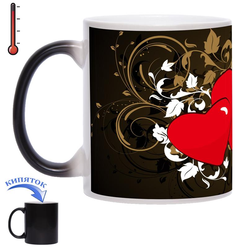 Чашка-хамелеон - оригінальний подарунок для Ваших друзів, колег і близьких людей. Наповніть чашку улюбленим гарячим напоєм - і проявиться любов двох сердець, обвенчанных чудовими вензелями... Чудовий подарунок для коханих! Також в наявності подарункові коробки. Підберемо для Вашої чашки найкращу! Зробіть чаювання яскравим і цікавим з чашкою-хамелеон!