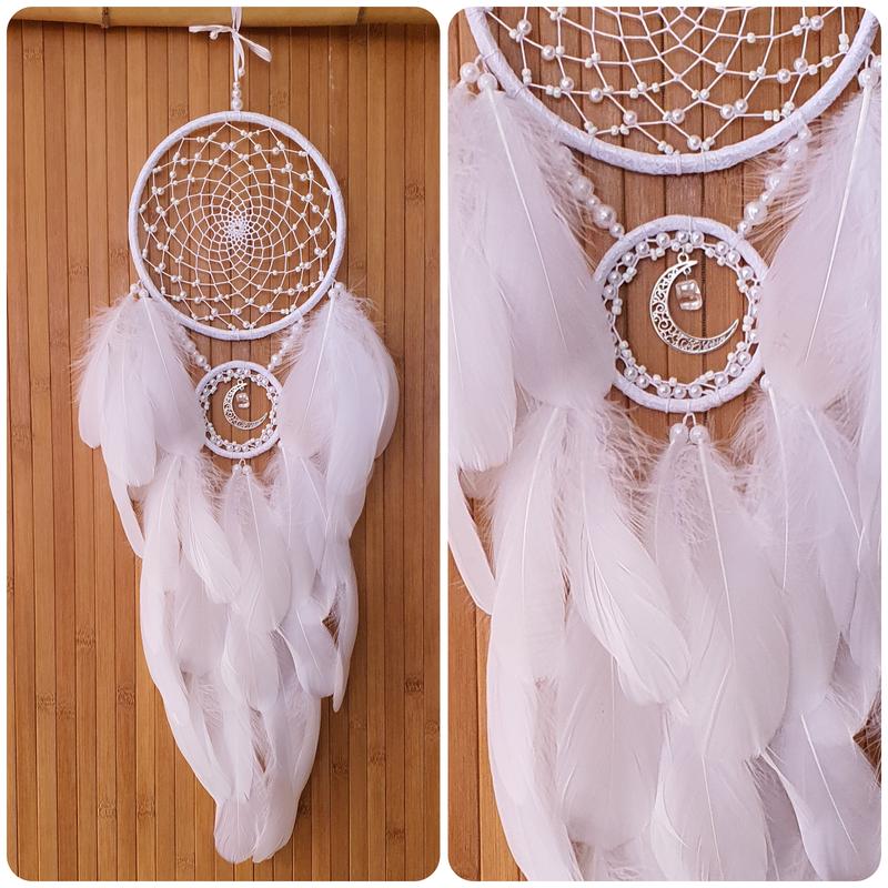 Біленький ловець снів диаметр 15см довжина 50см. Чудовий подарунок для коханих. Білий ловець снів із підвісом у формі полумісяця — ніжний та стильний декор для вашого дому . Основа акуратно обплетена білими нитками, всередині — витончена ажурна павутинка. Композицію доповнює підвіс у вигляді полумісяця, що додає виробу особливої символіки та легкого містичного настрою. Пір’я та декоративні елементи в білому кольорі створюють відчуття чистоти, гармонії та спокою.