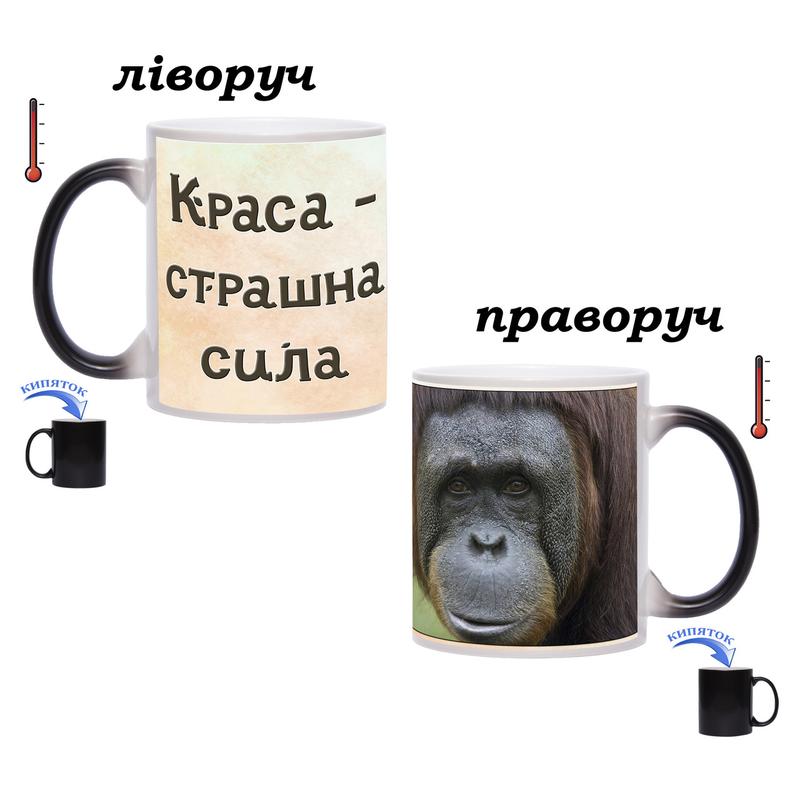 Чашка хамелеон - оригінальний подарунок для Ваших друзів, колег та близьких людей. При наповненні окропом на чашці хамелеон проявляється барвистий напис "Краса страшна сила" та зображення мавпочки. Ця чашка буде стильним подарунком до будь-якого свята. Зробіть звичайне чаювання яскравим та цікавим із чашкою хамелеон!