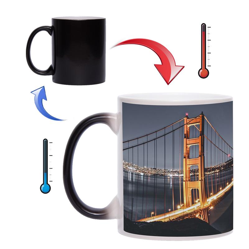 Чашка хамелеон - оригинальный подарок для Ваших друзей, коллег и близких людей. При наполнении кипятком, на чашке хамелеон проявляется красочное изображение моста Золотые Ворота. Данная чашка будет стильным подарком к любому празднику. Сделайте обычное чаепитие ярким и интересным с чашкой хамелеон!