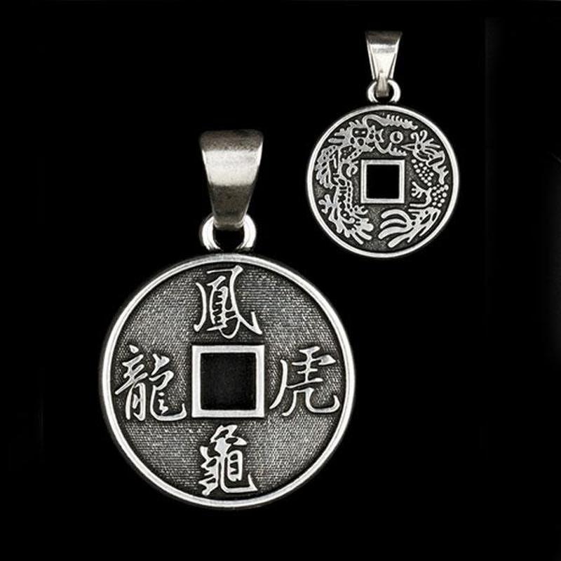 Китайська монета — стародавній східний символ щастя й багатства. Дві сторони монети представляють гармонію Інь і Ян. На боці Інь зображені фенікс, що змивають вгору, і Дракон, що вказує на відповідність у відносинах і безперервний фінансовий ріст. Сторони Ян прикрашають чотири символіки небесних тварин: Тигра, Черепахи, Дракона та Фенікса. Згідно з наукою Фен-Шуй, це потужні символи захисту від будь-яких втрат і невдач. Матеріал Ювелірна сталь, посріблення Розмір (см.) 2 х 2 У комплекті Шнурок із застібкою + анотація