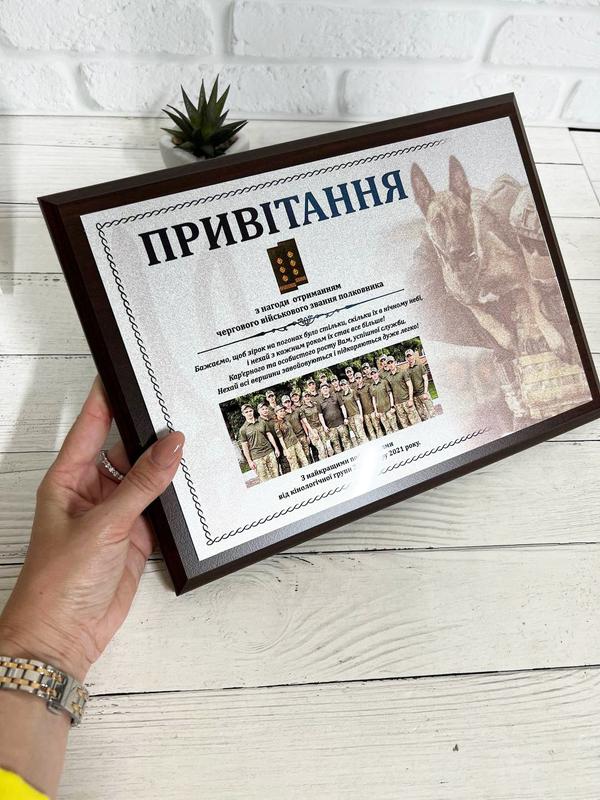 Металеві дипломи, грамоти та сертифікати використовуються для вручення співробітникам і партнерам, такі вироби виглядають дорого і престижно. Друк проводитися на металі методом повнокольорового друку сублімації. Колір металу на вибір: золото / срібло Дерев'яна підкладка: колір венге Кріплення передбачено. Розмір: 220х300мм При оформленні замовлення в коментарях вкажіть текстову інформацію, яка буде розміщена на металі. Або надішліть інформацію нам на пошту ********@******* або Вайбер *************. Перед друком ми надсилаємо на Вашу електронну адресу або Вайбер макет з Вашими даними згідно зразка і після Вашого твердження, наносимо на виріб!