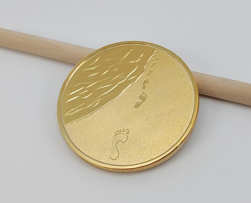 Монета "коли ти побачила тільки одну пару слідів, тоді я поніс тебе" (колір — золото). Діаметр монети 4,00 см, товщина 0,32 см., вага 35.00 грм. До комплекту входить пластиковий футляр для зберігання монети. Матеріал — метал, колір — золото.