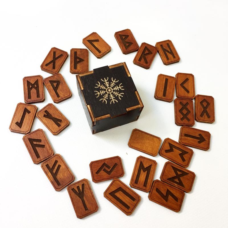 Руни зроблені з дерева (товщина 3 мм) Покриті фарбою і лаком на водній основі. Якісне лазерне гравіювання, тонування рун у чорний колір. Розмір 3 см х 2 см 24 руни + 1 порожня (для більш точного читання) Колір дерева може відрізнятися трохи на різних моніторах Руни упаковані в дерев'яну коробочку + оксамитовий мішечок На кришці коробочки гравіювання захисного символу "Шолома Жаху"